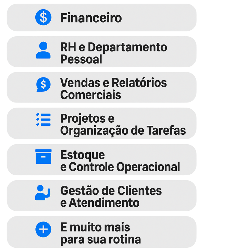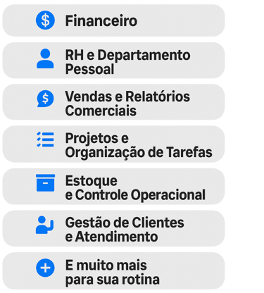 Chega de cursos longos e desconectados. Você terá ferramentas práticas, modelos prontos e exemplos aplicados nas áreas mais usadas no dia a dia: